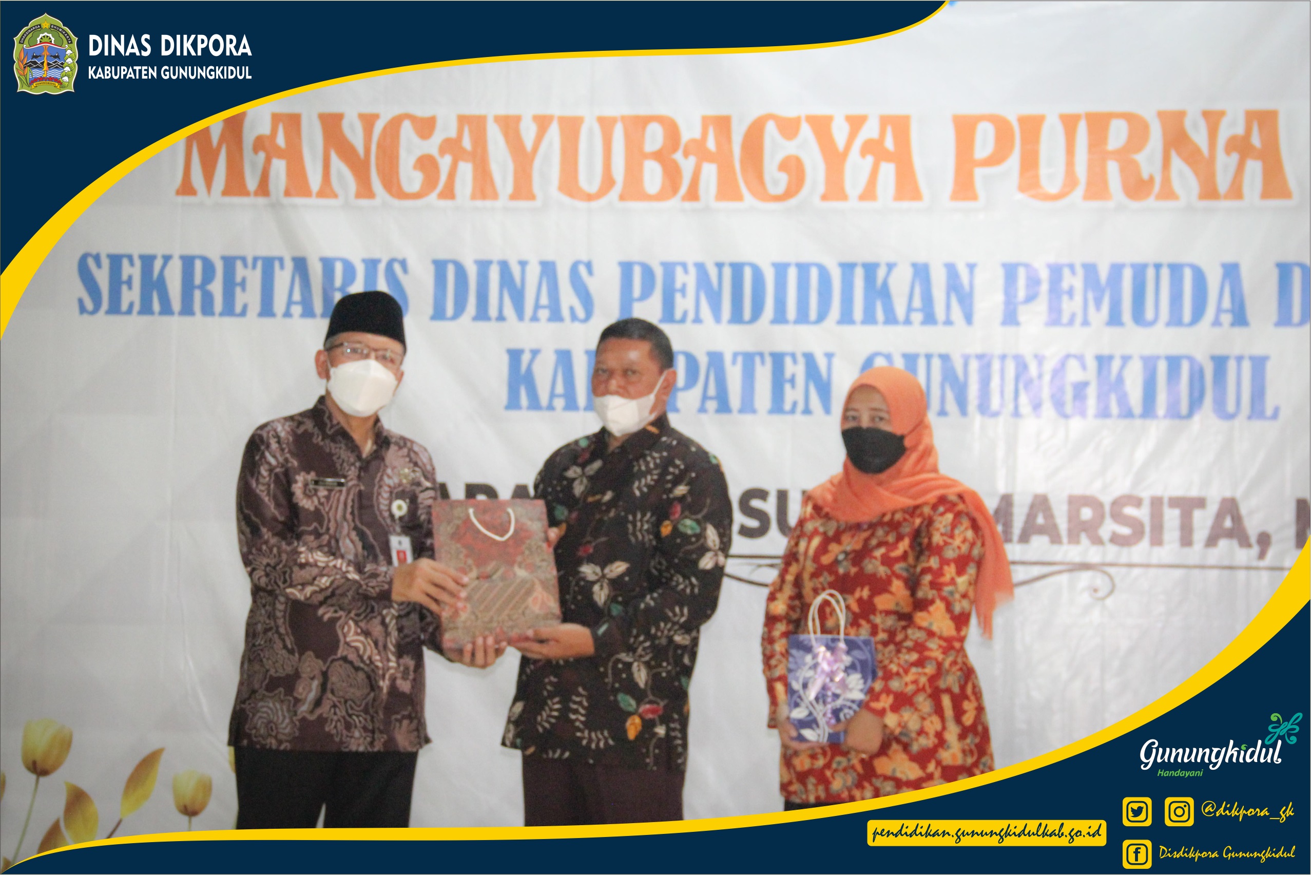 WONOSARI – Dinas Pendidikan, Pemuda, dan Olahraga (Disdikpora) Kabupaten Gunungkidul menyelenggarakan kegiatan Pelepasan Purna Tugas Bapak Drs. Sudya Marsita, M.M. selaku Sekretaris Disdikpora Kabupaten Gunungkidul. bertempat di gedung Kesenian Wonosari kegiatan dihadiri oleh Drs. Ali Ridlo, M.M. selaku Pelaksana Tugas (PLT) Kepala Dinas Pendidikan, Pemuda, dan Olahraga Kabupaten Gunungkidul dengan diikuti oleh karyawan Disdikpora kabupaten Gunungkidul.
